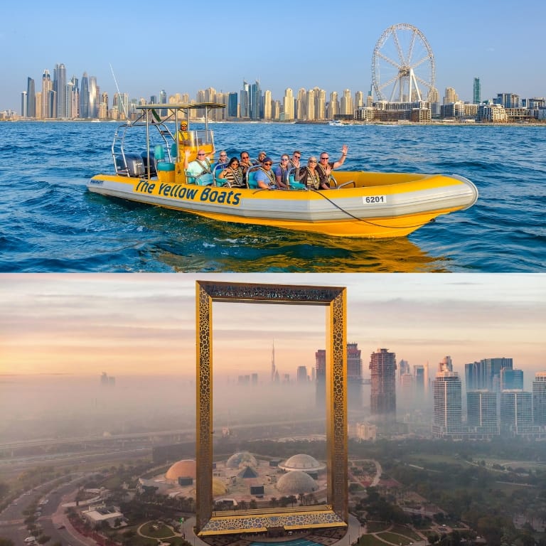 How to get there: Yellow Boat: Via E12 Highway (Sheikh Khalifa Bin Zayed Highway) Take the Corniche Road towards Mina Zayed Port and follow signs for Yas Island. Take the E12 Sheikh Khalifa Highway. Follow the blue signs that say, ‘Yas Leisure Drive’ and follow the brown tourist signs that say, ‘Ferrari World Abu Dhabi’. drive till you reach Yas Bay Parking lot Dubai Frame By car: Dubai Frame is centrally located and is easily accessible by car. You can park the car in the corresponding parking. Charges may apply.  By public transportation: Dubai Frame is easily accessible by public transportation. If you are taking the metro, you can get off at the Max metro station and take a short bus or walk to the destination.  By taxi: You can also take a taxi to Dubai Frame from anywhere in Dubai. It’s a popular destination, and most taxi drivers will be familiar with the location. Experience the epitome of Dubai’s allure with our exclusive combo package, designed to unlock the city’s most iconic sights and experiences. Begin your adventure with the Yellow Boat 99 Mins Premium Boat Tour, a journey that traverses Dubai’s picturesque coastline and renowned landmarks. Cruise through the glittering waters of Dubai Marina, marvel at the architectural wonders of JBR, Ain Dubai, and the Palm Jumeirah, and capture unforgettable moments against the backdrop of Atlantis the Palm and the majestic Burj Al Arab. As the tour meanders back to shore, relish panoramic views of the Royal Palaces, Palm Lagoon, and Marina, ensuring every angle of Dubai’s splendor is captured. Next, ascend to new heights with a visit to the Dubai Frame, a towering structure that offers a unique perspective of the city’s past and present. Standing tall at 150 meters, the Dubai Frame is an architectural marvel, resembling a colossal picture frame that perfectly frames the city’s skyline. Step into the glass walkway of this golden frame and be mesmerized by the contrasting vistas of old Dubai juxtaposed with the modern cityscape. From this vantage point, immerse yourself in the rich history and promising future of the region through interactive digital experiences, gaining insight into Dubai’s remarkable evolution. Indulge in this unparalleled experience that seamlessly blends sightseeing with cultural enrichment, ensuring memories to cherish for a lifetime in the dynamic city of Dubai. 99 Minutes Premium Boat Tour + FREE Dubai Frame – Combo at Dubai Marina Walk, Marina Gate Next to The Coffee Club, Dubai Marina, Dubai, United Arab Emirates attractions Attractions Special Offers Yellow Boats (Dubai)