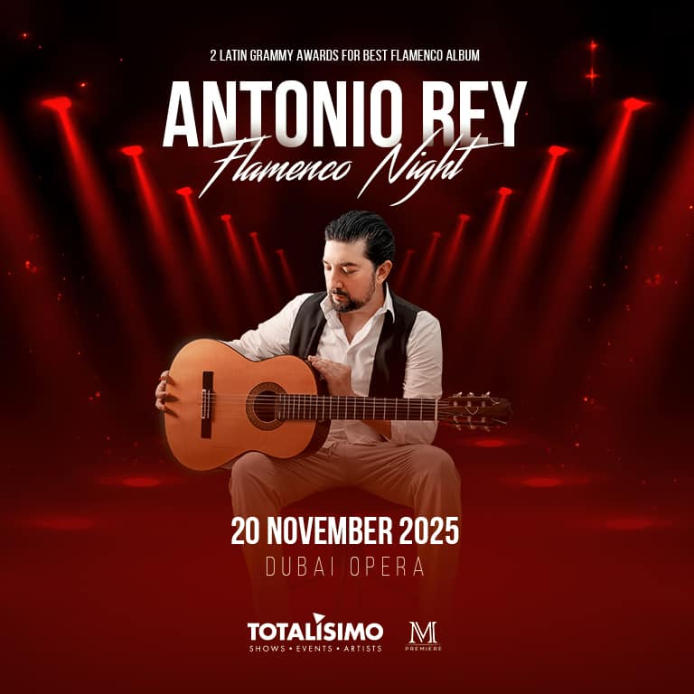 Antonio Rey – Flamenco Night at Dubai Opera M Premiere proudly presents a breathtaking evening with Antonio Rey, the legendary flamenco guitarist-virtuoso and two-time Latin Grammy Award winner, performing live for the first time in Dubai. Step into a world of rhythm, soul, and fire as Antonio Rey brings the spirit of Spain to the majestic stage of Dubai Opera. Renowned across the globe for his spellbinding technique and emotional depth, Rey’s music transcends borders—blending tradition with innovation in a way only a true maestro can. With two Latin Grammys for Best Flamenco Album and performances in the world’s most prestigious venues, Antonio Rey is celebrated as one of the greatest flamenco guitarists of his generation. His music tells stories—intimate, powerful, unforgettable. On 20 November, witness this one-night-only concert, where Rey will be joined by an ensemble of world-class guest artists such as Manuel Pinto (guitar), Ané Carrasco (percussion), Ismael Alcina (bass), Juan Parrilla (flute), Yona Luna (singer and palmas), Kika Quesada (dancer) and Mara Rey (singer and dancer). Together, they will deliver a mesmerizing performance that promises to ignite your senses and stir your soul. Lose yourself in the passion. Feel the pulse of flamenco. This is more than a concert. It’s a journey. This event is presented by M Premiere Hotline: +97150 7686418 Antonio Rey – Flamenco Night at Dubai Opera at Dubai Opera, Sheikh Mohammed bin Rashid Boulevard, Dubai, United Arab Emirates events Concerts Dubai Opera