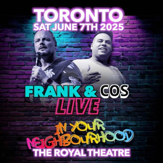 8 : ⭐ The infamous Frank and Cos will be live in Toronto performing their sketch comedy at The Royal Theatre. Get your tickets before they are gone! By popular demand, new 5pm showtime added! Highlights Touring and filling out venues all over Canada, Frank Spadone and Cosimo Tucci are a must-see duo Perfect for anyone looking to enjoy a good laugh General Info Date: Saturday June 7, 2025 Time: 5:00p.m. & 8:30 p.m. (doors open at 4:00 p.m. & 7:30 p.m.) ⏳ Duration: 120 minutes Location: The Royal Theatre – 608 College St, Toronto, ON M6G 1B4, Canada Age requirement: 16+ ♿ Accessibility: the venue is accessible for people with reduced mobility ❓ Please consult the FAQs of this experience here Description Catch Frank and Cos live, in Toronto, as they return to the Royal Theatre performing their hilarious sketch comedy show ‘Live in your Neighborhood’. Featuring video clips and live performances from Frank Spadone and Cosimo Tucci. This show will sell out fast so get your tickets now before they are gone! FRANK & COS LIVE IN YOUR NEIGHBOURHOOD at The Royal Theatre, Toronto, Canada