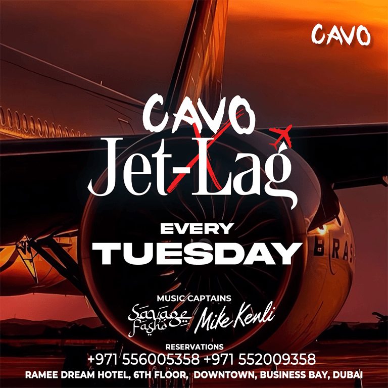 – Schedule The doors open at 10:00 pm and captivating the audience until 04:00 am How to get there: By car: Drive on Sheikh Zayed Road, take Exit 29 to Al Marsa Street, then Follow Al Falea Street and Al Khayay Street to reach Cavo. By public transportation: Take the Red Line Metro and exit at Business Bay Metro Station. From there, you can walk or take a short taxi ride to reach the club. By taxi: You can also take a taxi to Cavo Club from anywhere in Dubai. It’s a famous destination and most drivers would be familiar with its location. @changingcurrents__ takes over @cavodxb on Tuesday, JUNE 3RD /10TH /17TH and 24TH for JetLag ️ Don’t miss the vibe! Reggaeton & Latin house hits by @dj and MC @dj_master_pimp until 4 AM Located on the 6th Floor of Ramee Dream Hotel, @cavodxb is one of the city’s most renowned party destinations, and we’re excited to welcome you each week with exceptional entertainment, impressive special effects, and the finest music in town. Grab your tickets now and be part of an electrifying experience! #dubai #dubainights #urban #uae #party #aviation #cabincrew #latin #latinnights #nightout #club #dance #fun #love #life #enjoy #friends #tuesday #reggaeton #funk #tierracaliente Jet-Lag at Cavo in Dubai at Cavo Restaurant, Dubai, United Arab Emirates events Nightlife Cavo