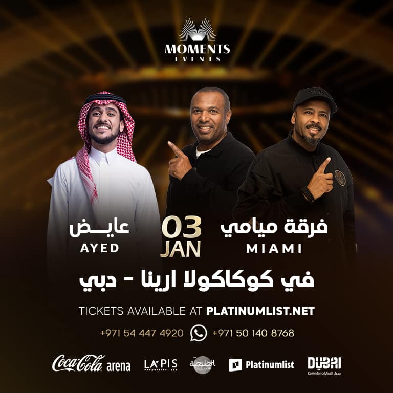 – Get ready to experience Miami Band and Ayed live at Coca-Cola Arena on 3 January 2026—a night of music you’ll never forget. Since their start in 1991, Miami Band has grown into a true Gulf music powerhouse. Their high-energy performances and unforgettable songs—like “Bastans,” “Ya Omre Ana,” and “Ya Helwakom”—have defined generations and continue to bring people together. Ayed Yousef, is known for his soulful voice and fresh sound keep Arabic traditions alive in a modern way. With beloved tracks such as “Halefeen,” “Saddiqeeni,” and “Jalsat Ibn El Awadem,” Ayed has earned his place among the region’s most admired voices. Don’t miss this special night—secure your tickets now and be part of the memories. Miami Band & Ayed live at Coca-Cola Arena at Coca-Cola Arena, Dubai, United Arab Emirates events Concerts Coca-Cola Arena Miami Band