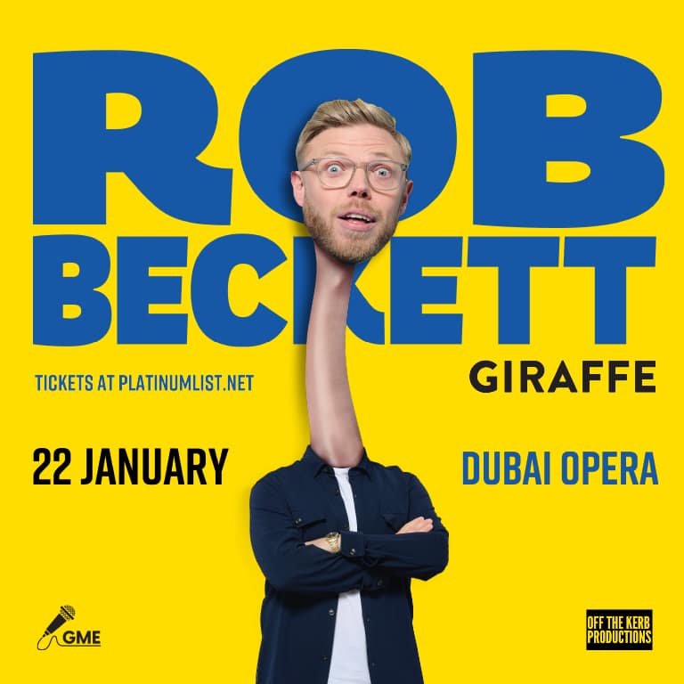 Rob Beckett at Dubai Opera Yes! Bobby Beckles, better known as Rob Beckett, returns to Dubai with his brand-new stand-up show, Giraffe, following a sell-out UK and Irish tour. From Bromley to Brisbane, he’s been smashing stages and motorways across the globe. Now he’s bringing the laughs back to the UAE, fuelled by takeaway dinners and hotel buffet breakfasts.