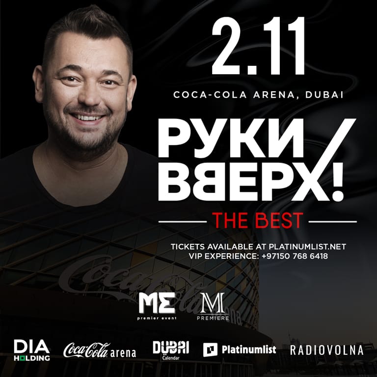 – РУКИ ВВЕРХ! в Дубае – и это будет мощно! 2 Ноября 2025 года, на сцене Coca-Cola Арены прозвучат «Крошка моя», «Студент», «18 мне уже», «Он тебя целует» и все все все песни, которые давно стали больше, чем просто хиты. Каждый трек — это воспоминания о первой любви, школьных дискотеках, постерах на стенах и кассетных магнитофонах. VIP-места – только по запросу Горячая линия: +971 50 768 6418 RUKI VVERH! / РУКИ ВВЕРХ! in Dubai at Coca-Cola Arena, Dubai, United Arab Emirates events Concerts Coca-Cola Arena Ruki Vverh / Руки Вверх!