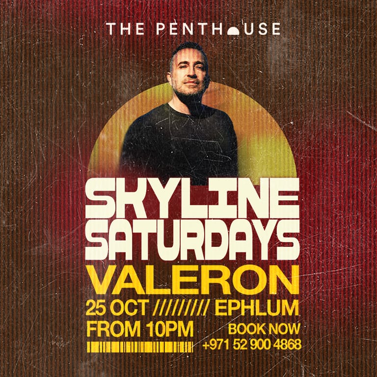 . From the unforgettable summers of Mykonos to dancefloors across the globe, Valeron has been setting the scene for over 11 years. His sound—Deep House, Organic House, and Afro House fused with traditional instruments—creates that rare flow that moves everyone. Known for standout tracks like Euphrates, Touch Me, and Asteromata, he’s a Beatport regular. Now, on 25 October, Valeron brings that energy to Skyline Saturdays at The Penthouse—bridging cultures, generations, and crowds on Dubai’s most iconic rooftop.